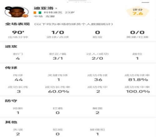 在本场比赛里,迪亚洛出战90分钟,取得1个进球,他在这场比赛里4次射门,其中3次射正1次射偏,2次尝试过人却皆没能成功;他在场上有着44次传球,其中36次成功,包括1次关键传球,传球成功率高达81.8%。迪亚洛还有着3次成功长传,成功率为60%;他有着2次传中,成功率为100%。