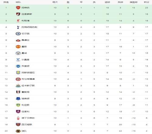 随着切尔西10热刺,阿森纳20,英超最新积分榜:利物浦20升第3