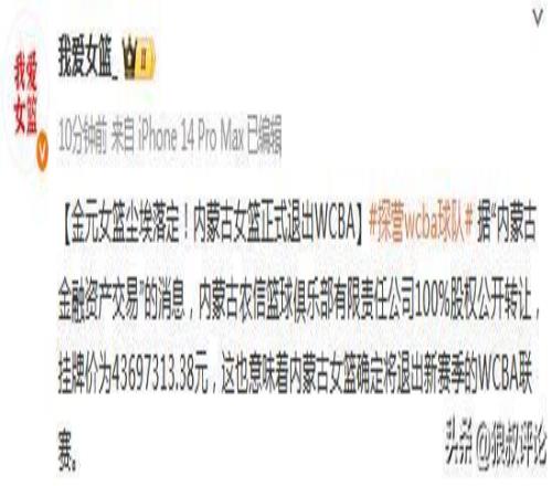 北京时间11月4日,根据媒体人“我爱女篮”的报道,据“内蒙古金融资产交易”的消息,内蒙古农信篮球俱乐部有限责任公司100%股权公开转让,挂牌价为43697313.38元,这也意味着内蒙古女篮确定将退出新赛季的WCBA联赛。
