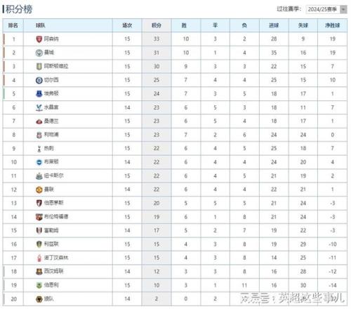 昨晚今晨,英超联赛第15轮激战多场,阿森纳客场1-2输给阿斯顿维拉,领先优势只剩2分,布恩迪亚读秒绝杀;曼城主场3-0完胜桑德兰,继续缩小积分差距,福登传射建功;切尔西客场0-0战平伯恩茅斯,连续3轮不胜;利物浦客场3-3战平利兹联,埃基蒂克梅开二度,日本球星田中碧补时绝平。